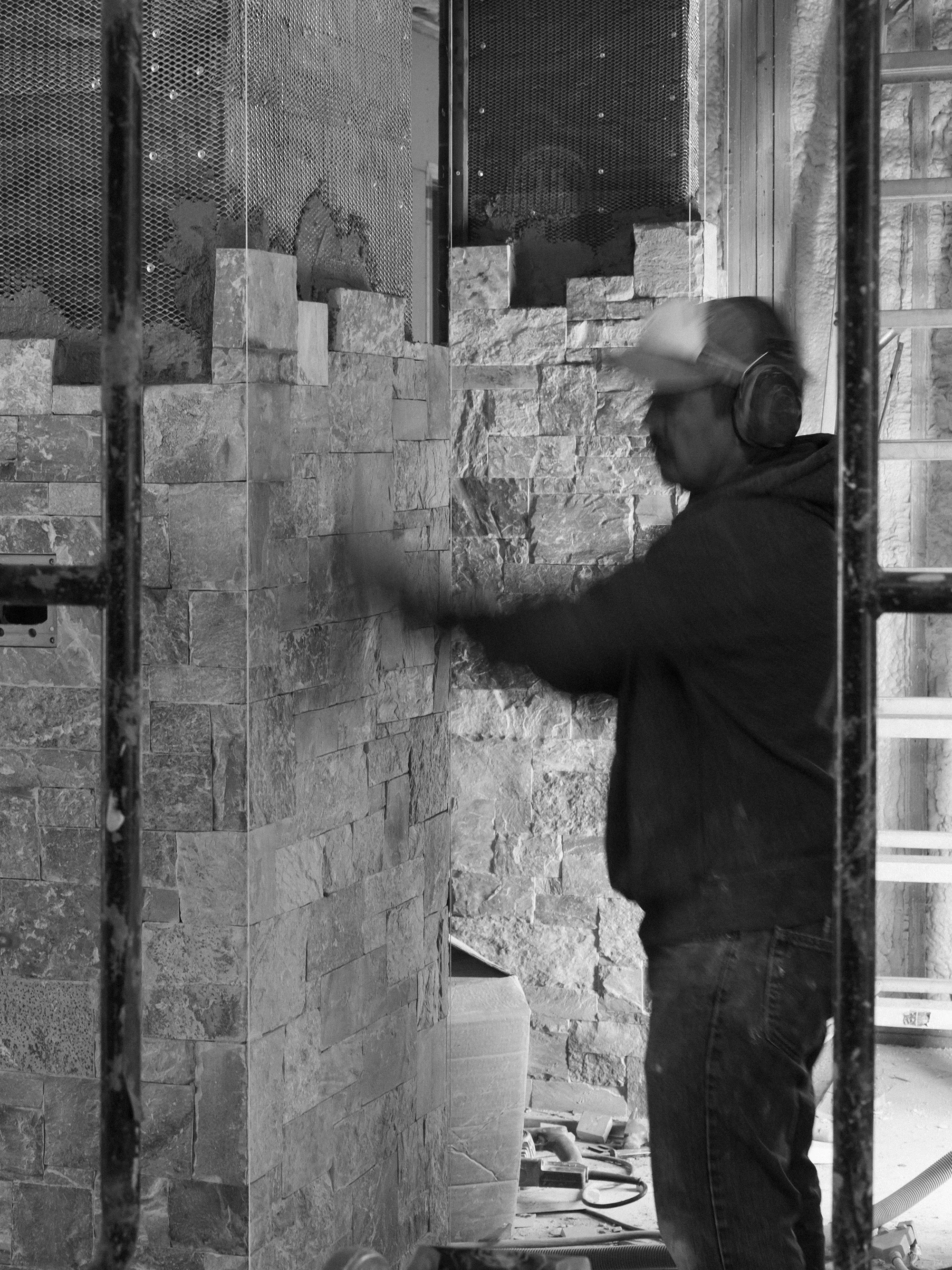 /During this stage of construction there’s a remarkable buzz of activity and orchestration between the many tradesmen here on the jobsite. There’s all of the infrastructure installations like wiring, ductwork, and plumbing detail that is still being addressed, while most visibly our masons apply stone veneer to the inside and exterior surfaces. This is where granite meets barn wood and the soon to be installed corten steel facia panels, creating a rustic modern aesthetic. We can begin to see aspects of a finished home take shape, yet there’s a garage just being framed, a complex layout of terraced landscaping, and a pool — all of which are in the early stages of construction.